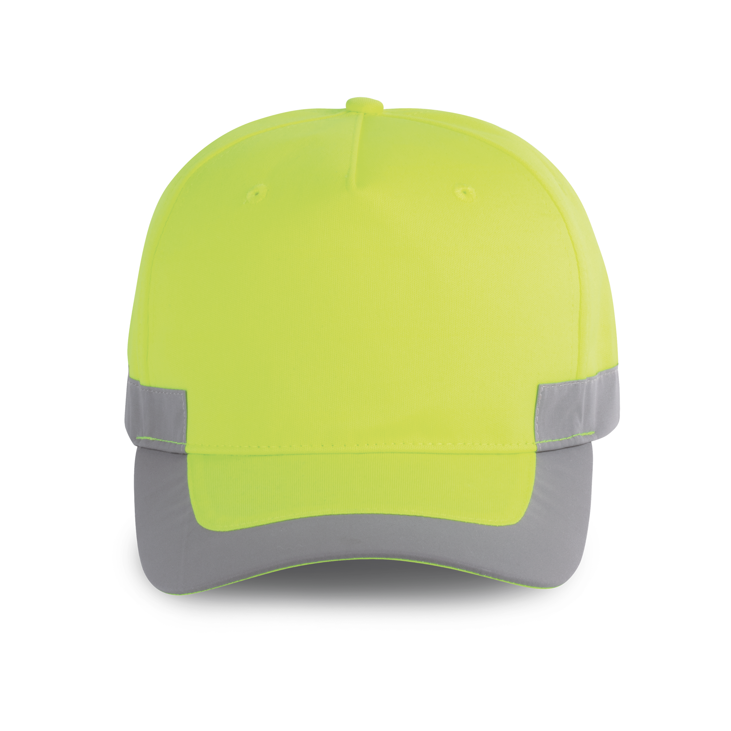 100% polyester. 5 panneaux. Casquette fluorescente. Fermeture réglable par bande auto-agrippante.