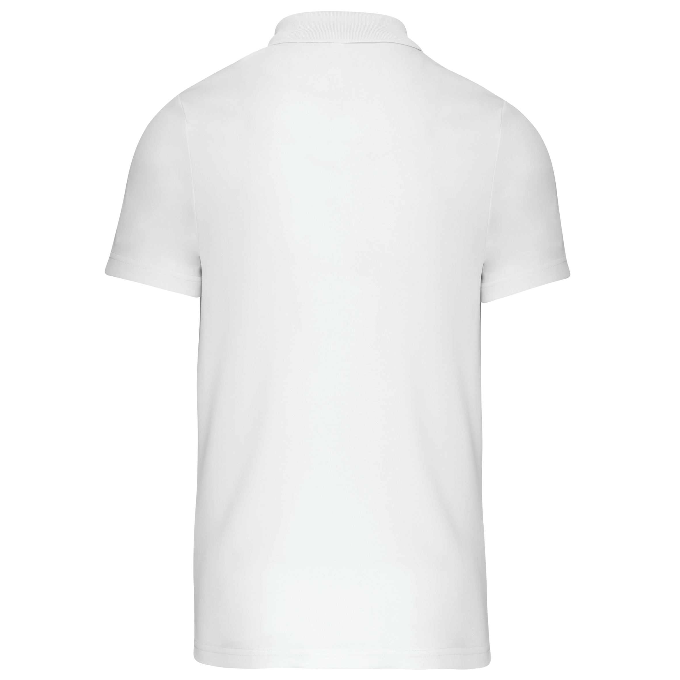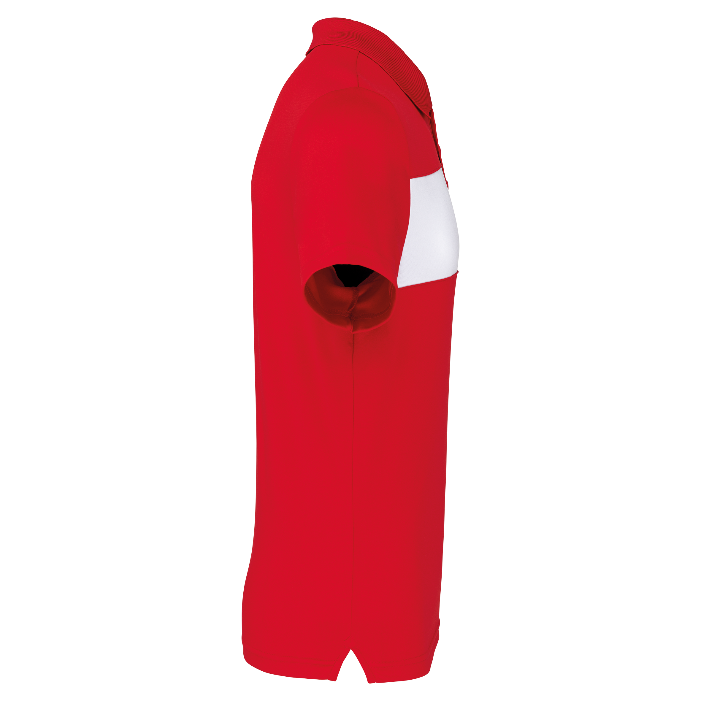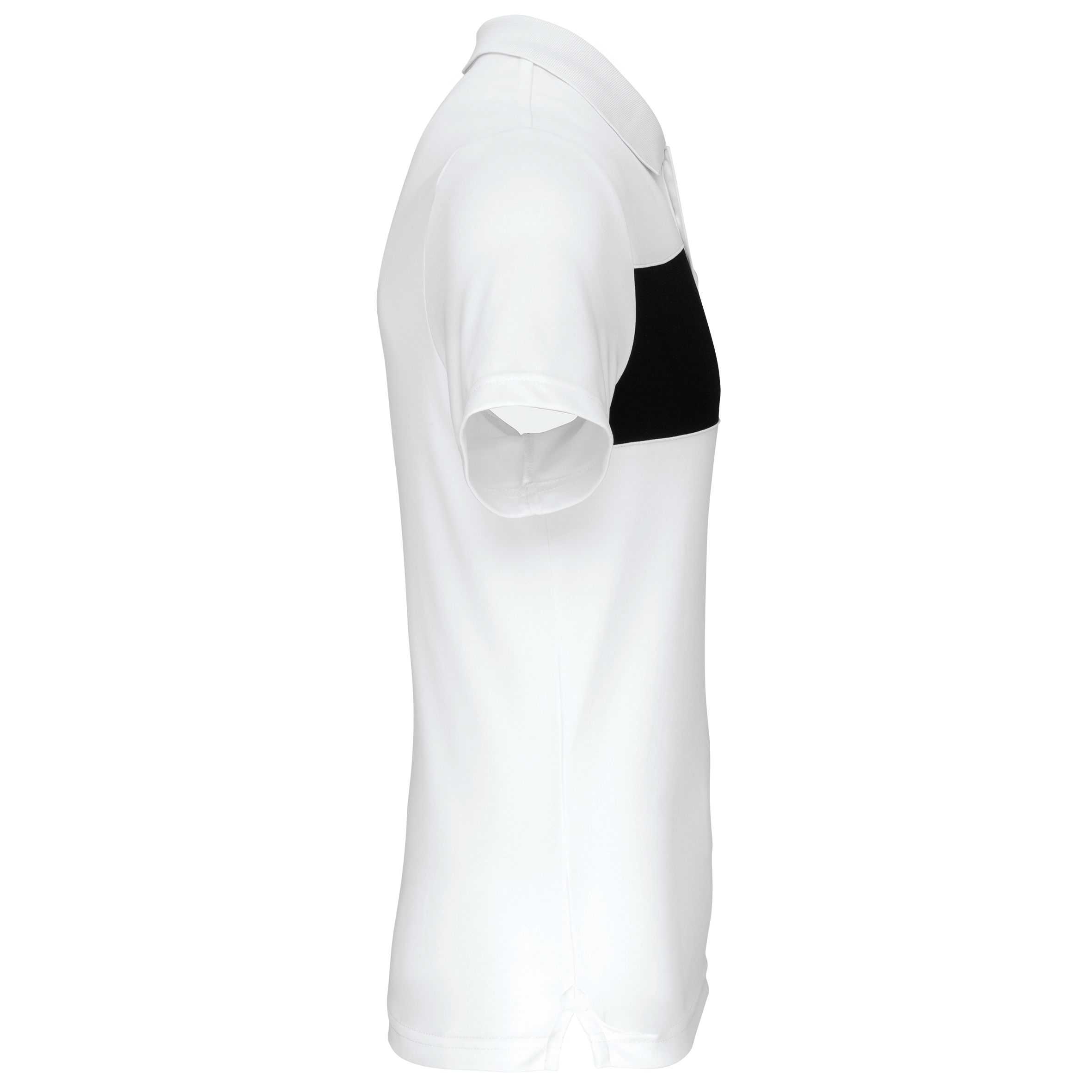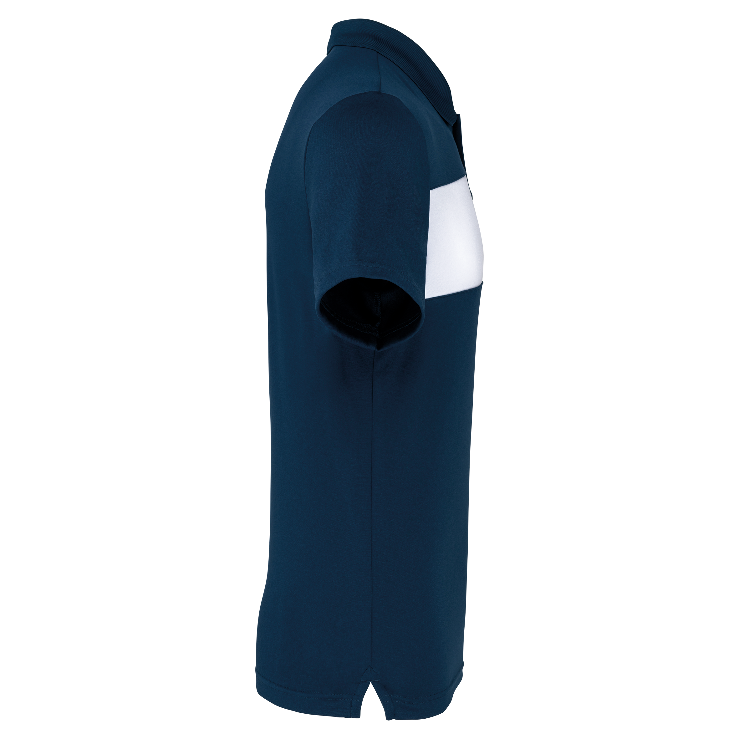 100% polyester. Maille interlock. Empiècement poitrine contrasté. Col en bord-côte avec bande de propreté. Patte 3 boutons ton sur ton. Fentes latérales. Finition double aiguille bas de manches e