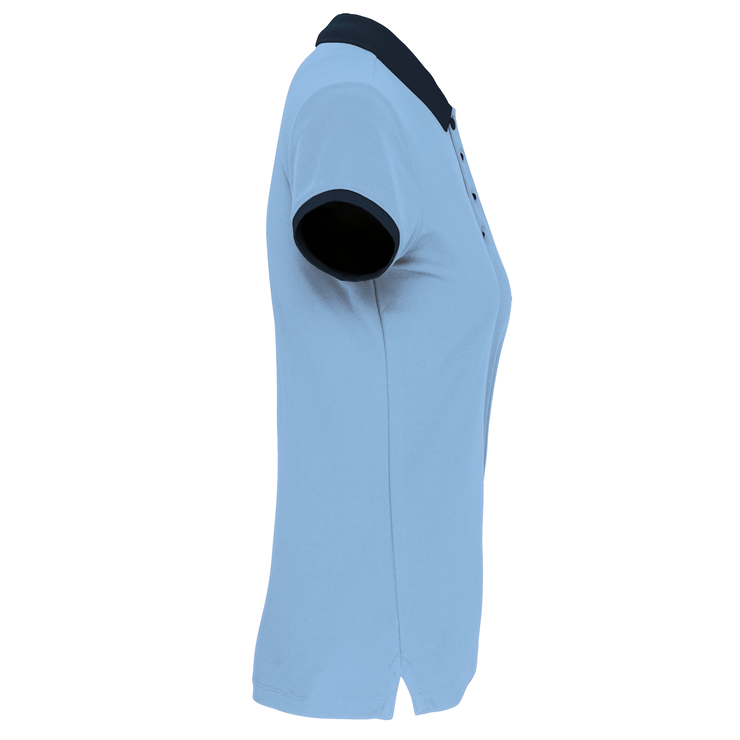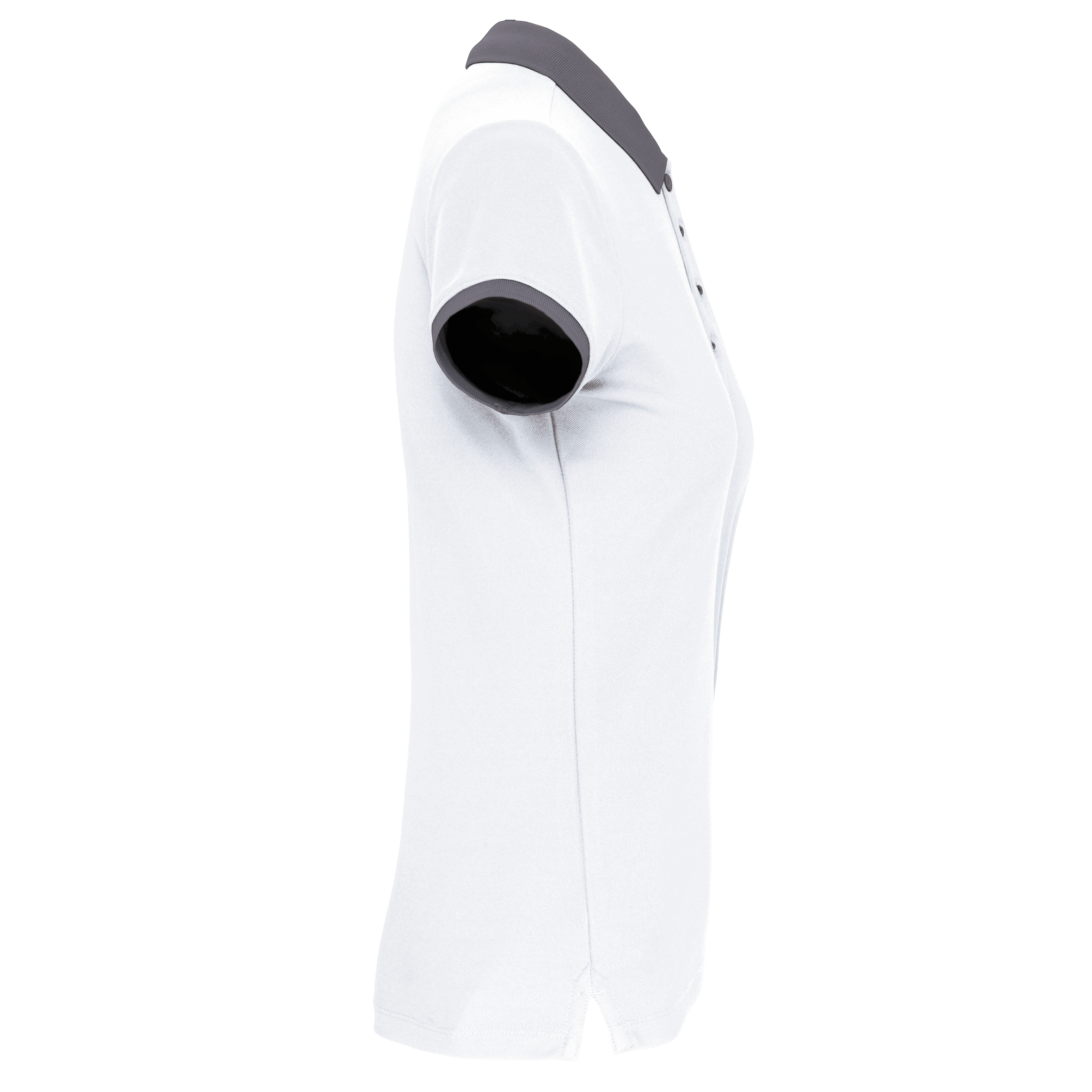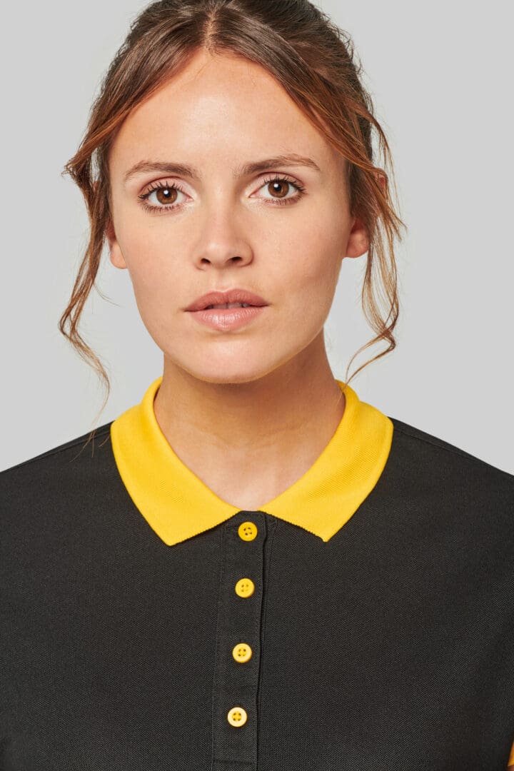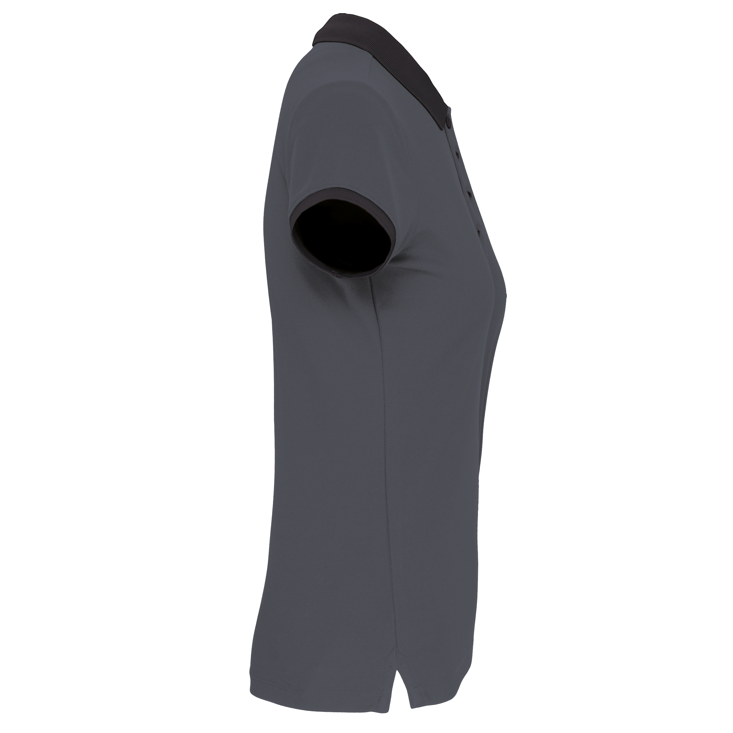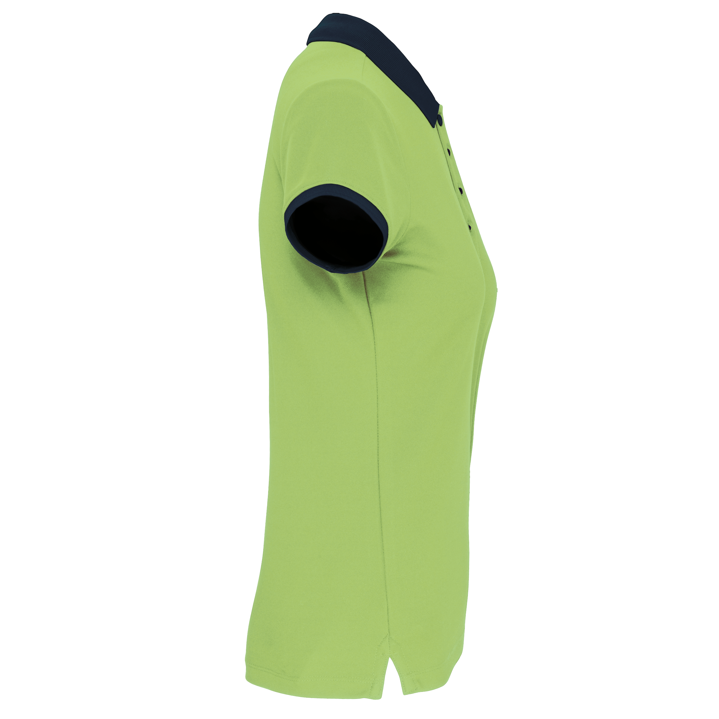 100% polyester. Maille piquée Cool Plus®. Coupe cintrée et look moderne. Col et bas de manche en bord-côte contrasté. Patte de boutonnage 4 boutons (contrastés ou unis selon modèle). Fentes latérales.
