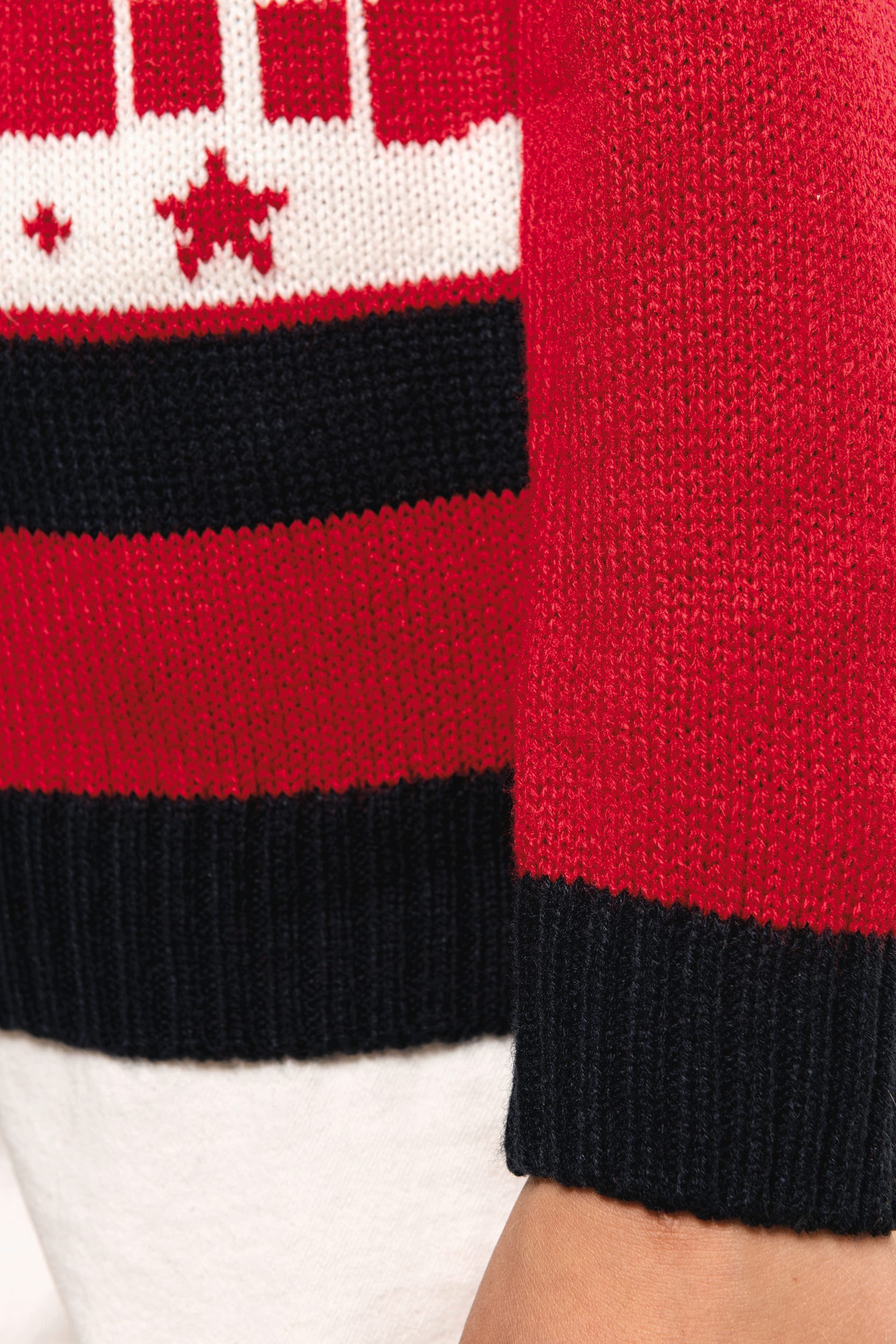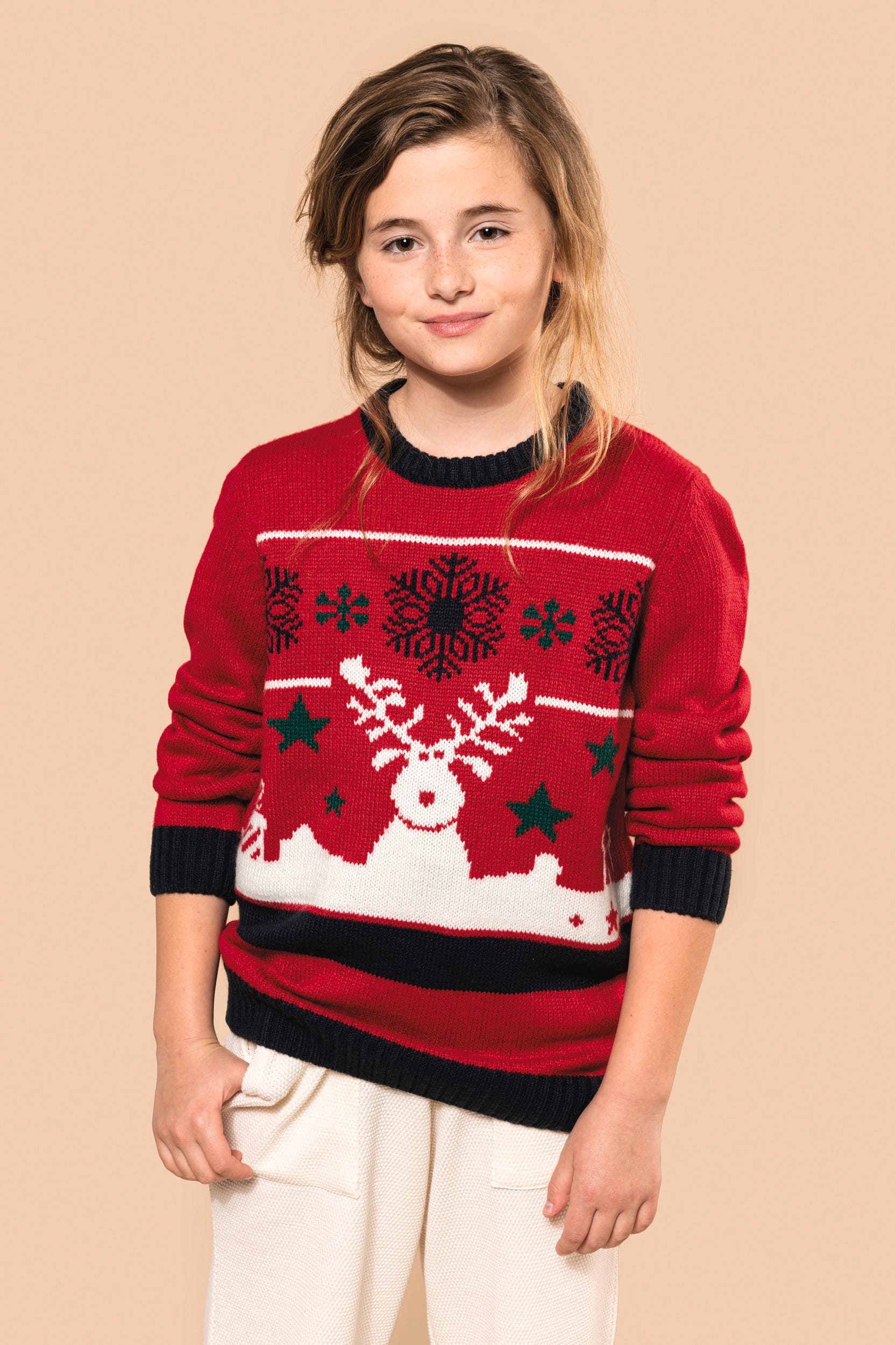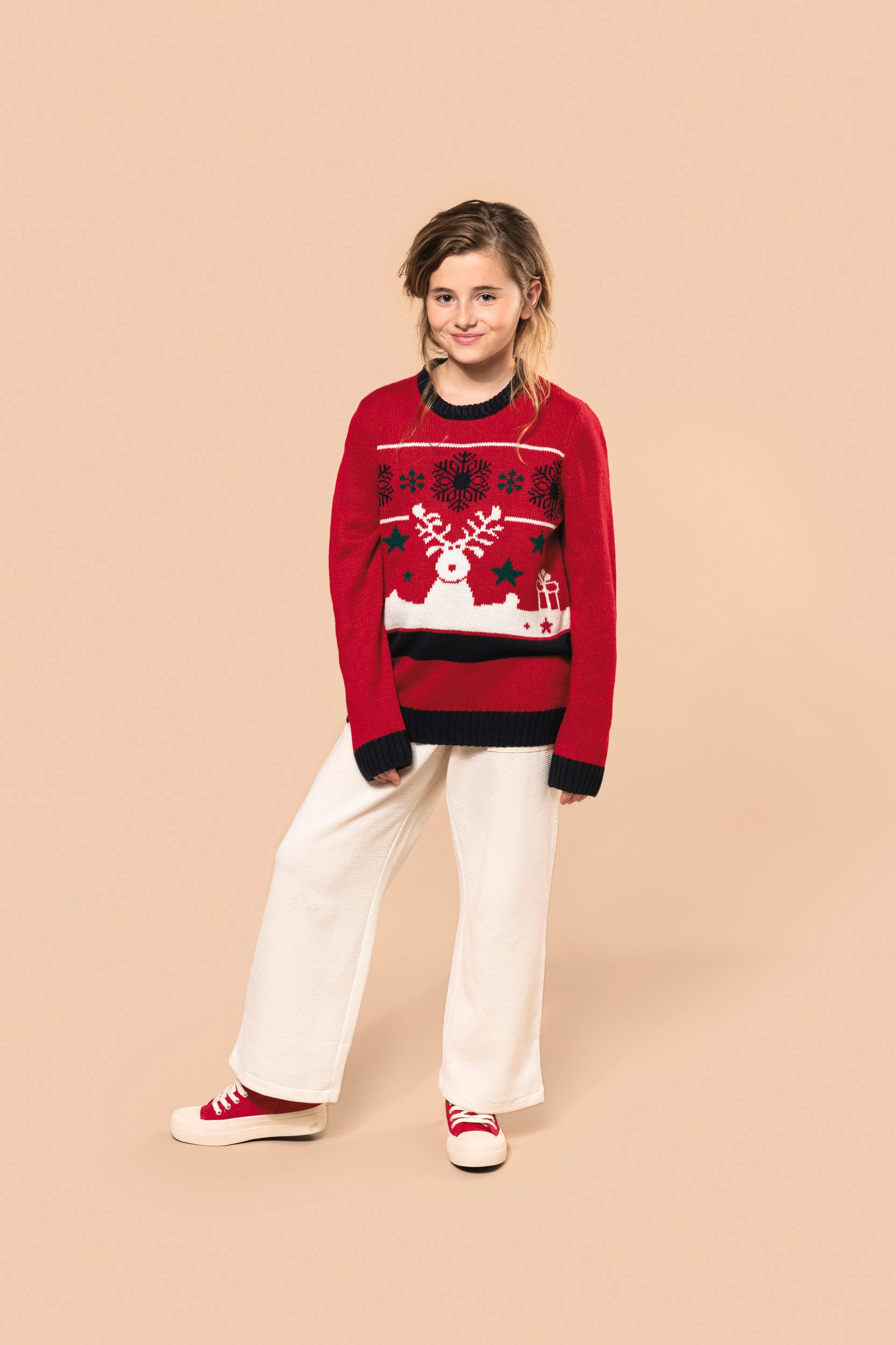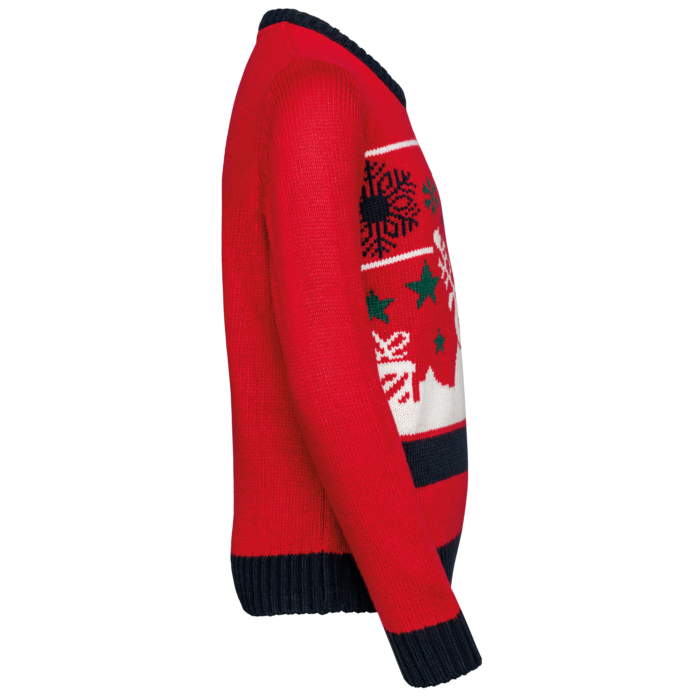 100% acrylique. Coupe ajustée. Jauge 5. Tricot intarsia à motifs de Noël devant. Tricoté en fully fashion : tricoté dans la forme et assemblé sur machine de remaillage. Col rond. Finitions bord côte 2×2 contrastés à l’encolure, poignets et bas de vêtement. Bande propreté ton sur ton avec la couleur majoritaire. Présence d’élasthanne dans le bord côte bas de manche et bas de vêtement pour éviter que le pullover se déforme. Pas d’étiquette de marque au col, uniquement une puce de taille pour faciliter la personnalisation.