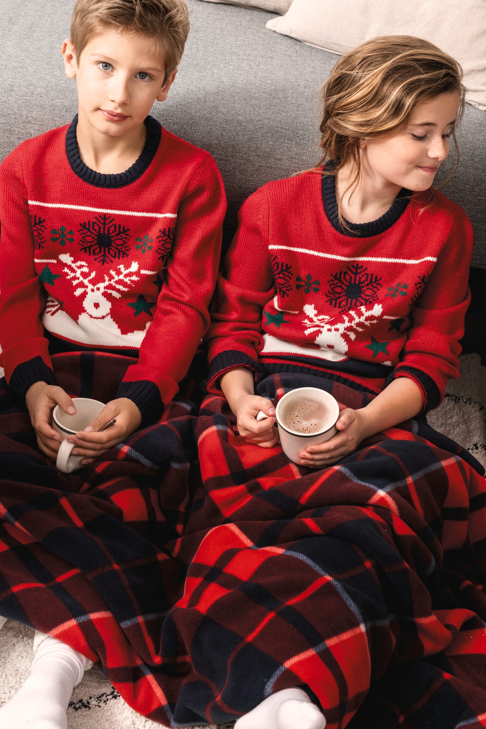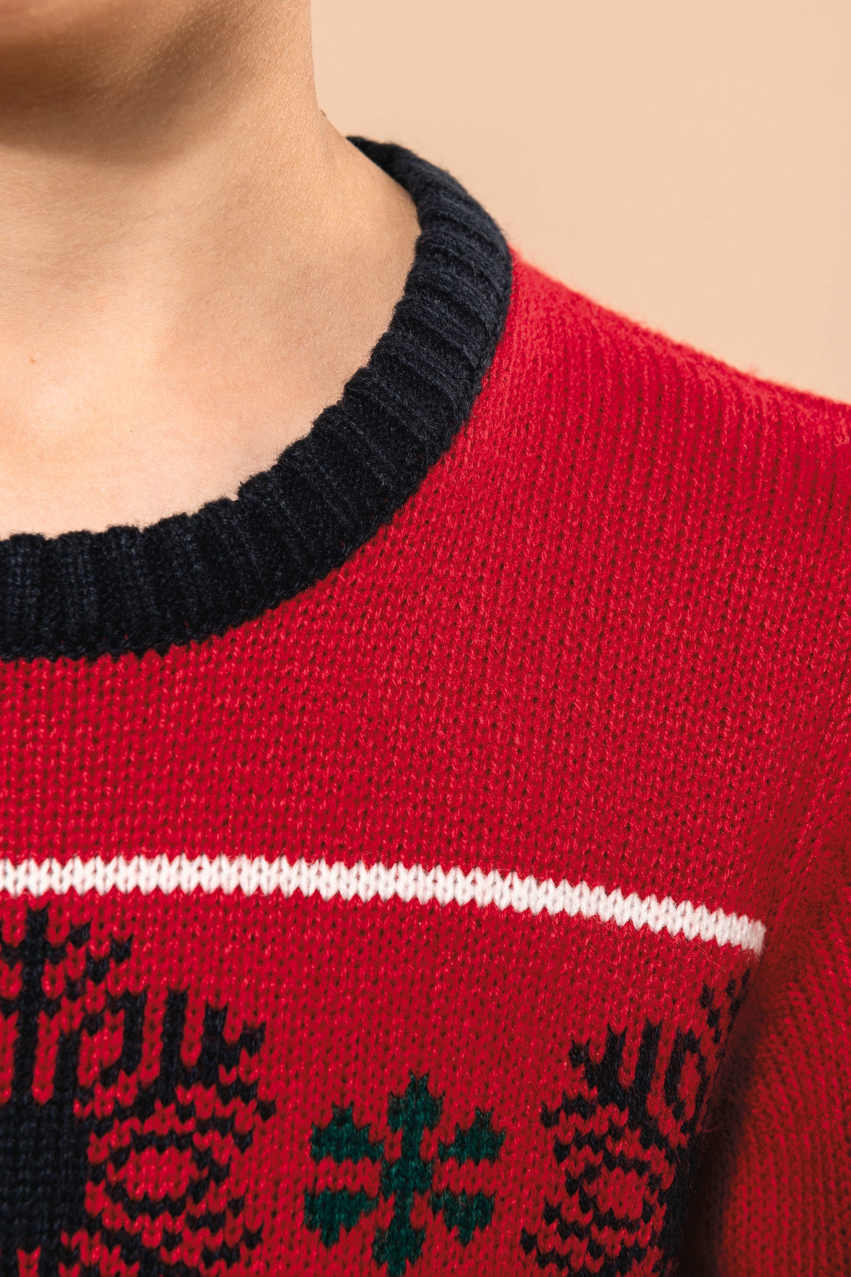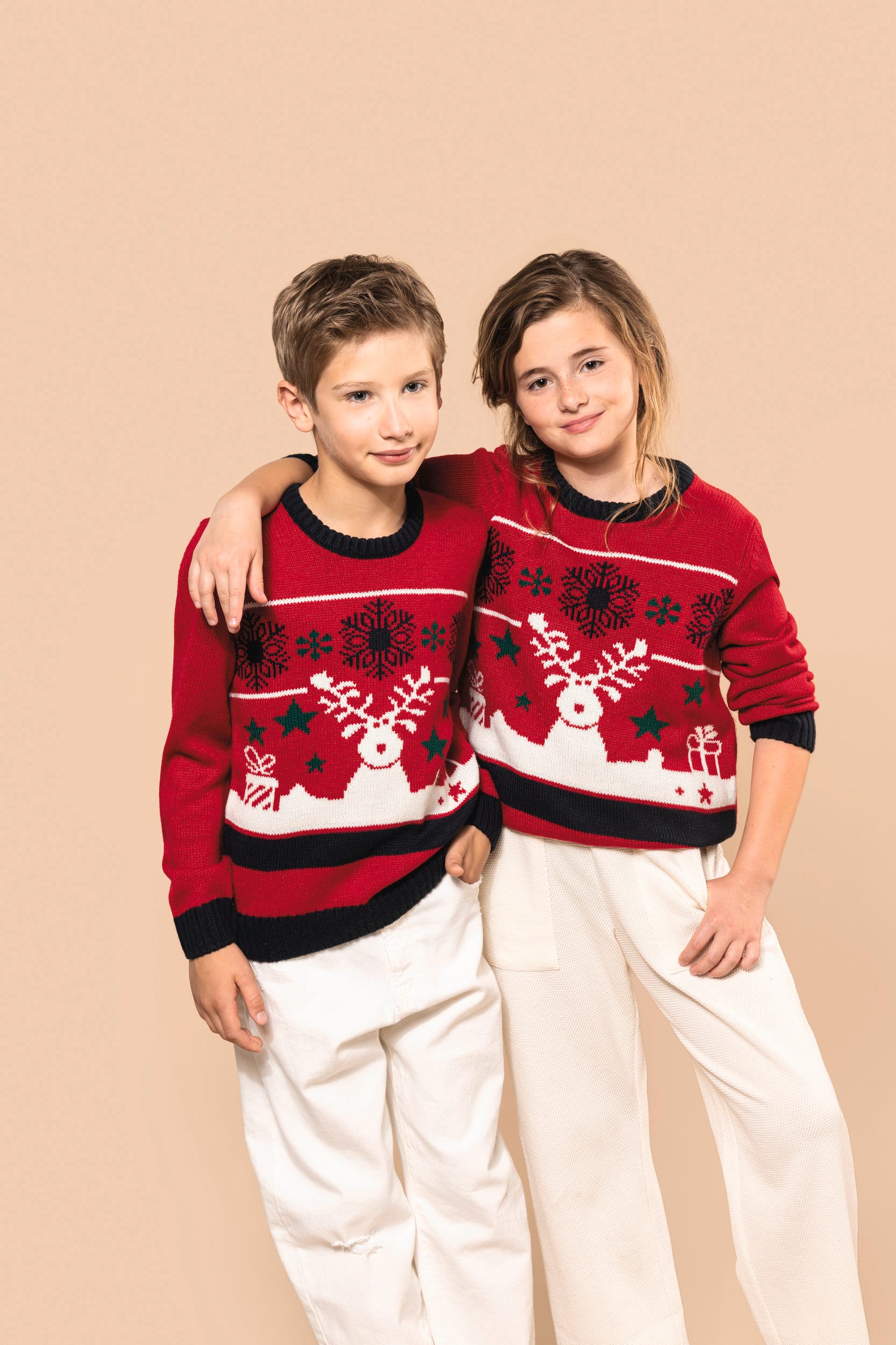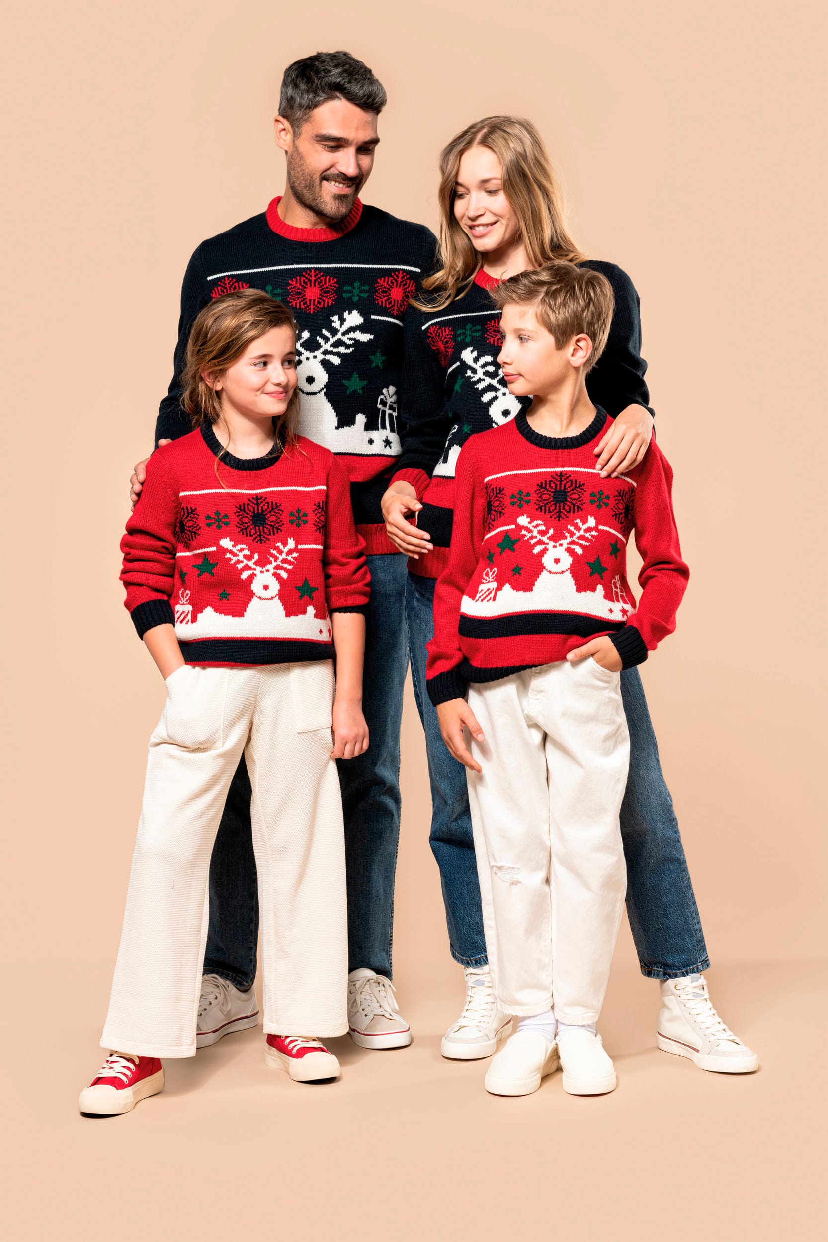 100% acrylique. Coupe ajustée. Jauge 5. Tricot intarsia à motifs de Noël devant. Tricoté en fully fashion : tricoté dans la forme et assemblé sur machine de remaillage. Col rond. Finitions bord côte 2×2 contrastés à l’encolure, poignets et bas de vêtement. Bande propreté ton sur ton avec la couleur majoritaire. Présence d’élasthanne dans le bord côte bas de manche et bas de vêtement pour éviter que le pullover se déforme. Pas d’étiquette de marque au col, uniquement une puce de taille pour faciliter la personnalisation.