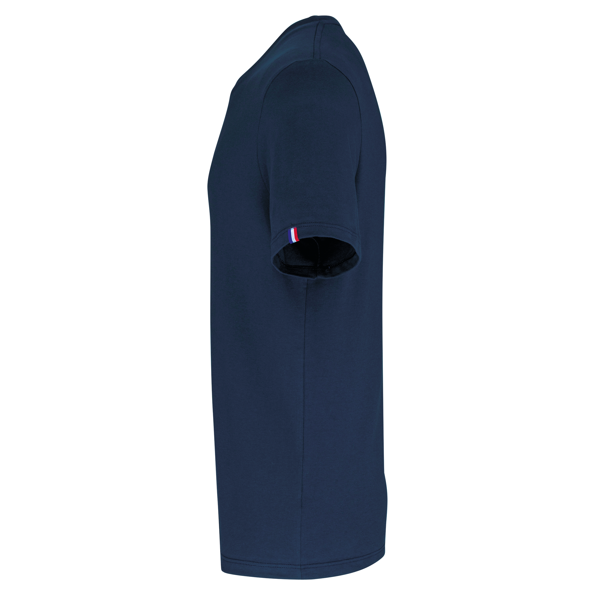 100% coton peigné biologique. Label « Origine France Garantie ». Coupé / cousu. Encolure ronde en bord-côte. Bande de propreté ton sur ton dans l’encolure (prolongement dos-épaule). Vignette clip Bleu / Blanc / Rouge sur le bas de manche gauche au porter. Finition double aiguille bas de manches et bas de vêtement. Emballage 100% recyclable.