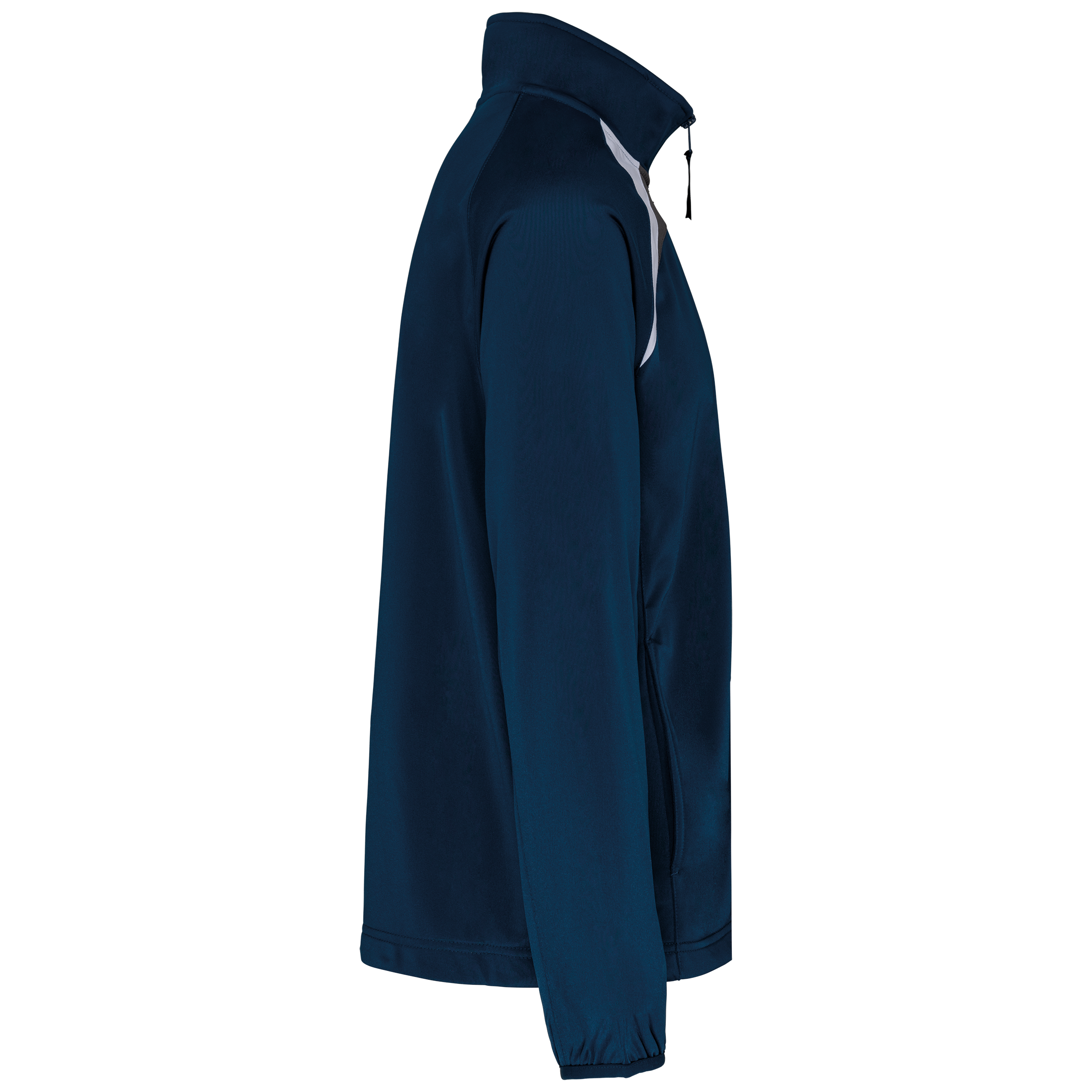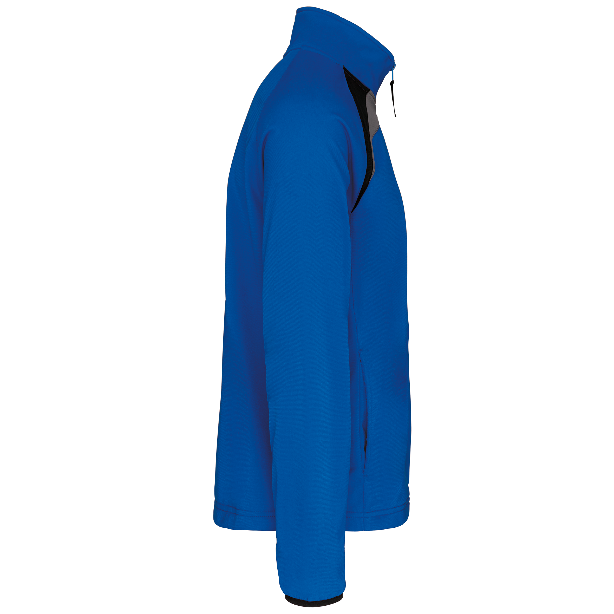 100% polyester tricot. Fermeture zippée. Empiècements contrastés. 2 poches latérales. Bas de manches avec bande élastique.