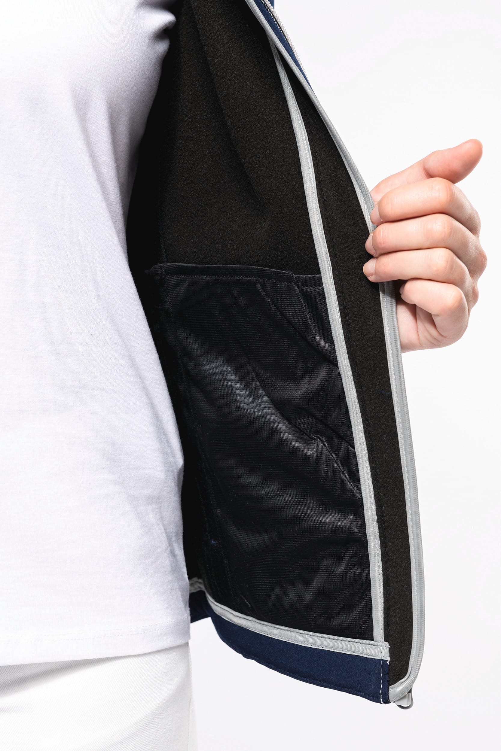 Extérieur : 95% polyester / 5% élasthanne. Intérieur : 100% polyester micropolaire. Tissu déperlant. Coupe cintrée. 2 poches extérieures zippées. Fermetures zippées contrastées. Dos rallongé. Finition surpiqûres aux épaules et côtés.